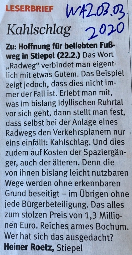 03.03.20 , WAZ , LeserBrief Kahlschlag